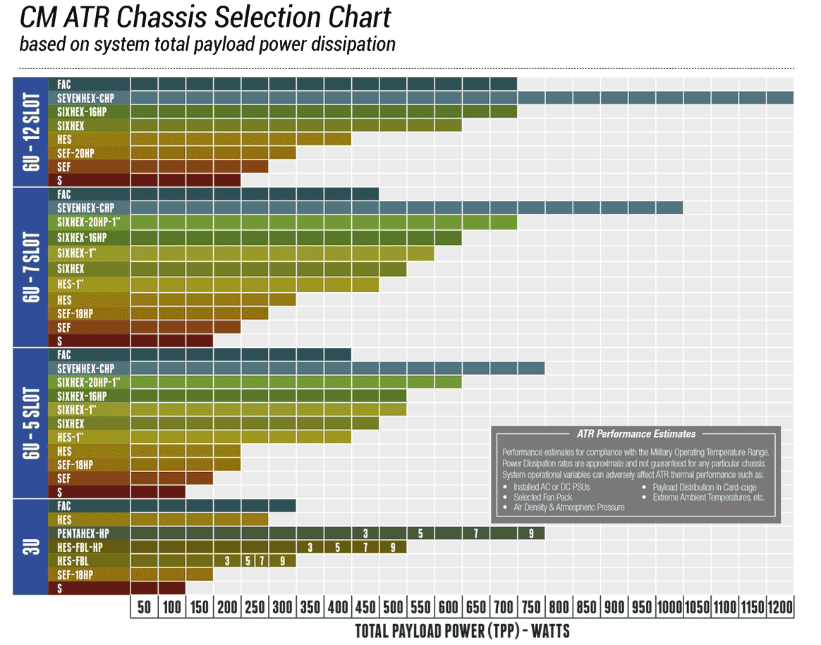 For reliable operation it is recommended the maximum Payload Power not be exceeded. Subject to operating conditions. All CM 3U ATR chassis are delivered tested, qualified and certified per Military Standards MIL-STD-461E & MIL-STD-810F.